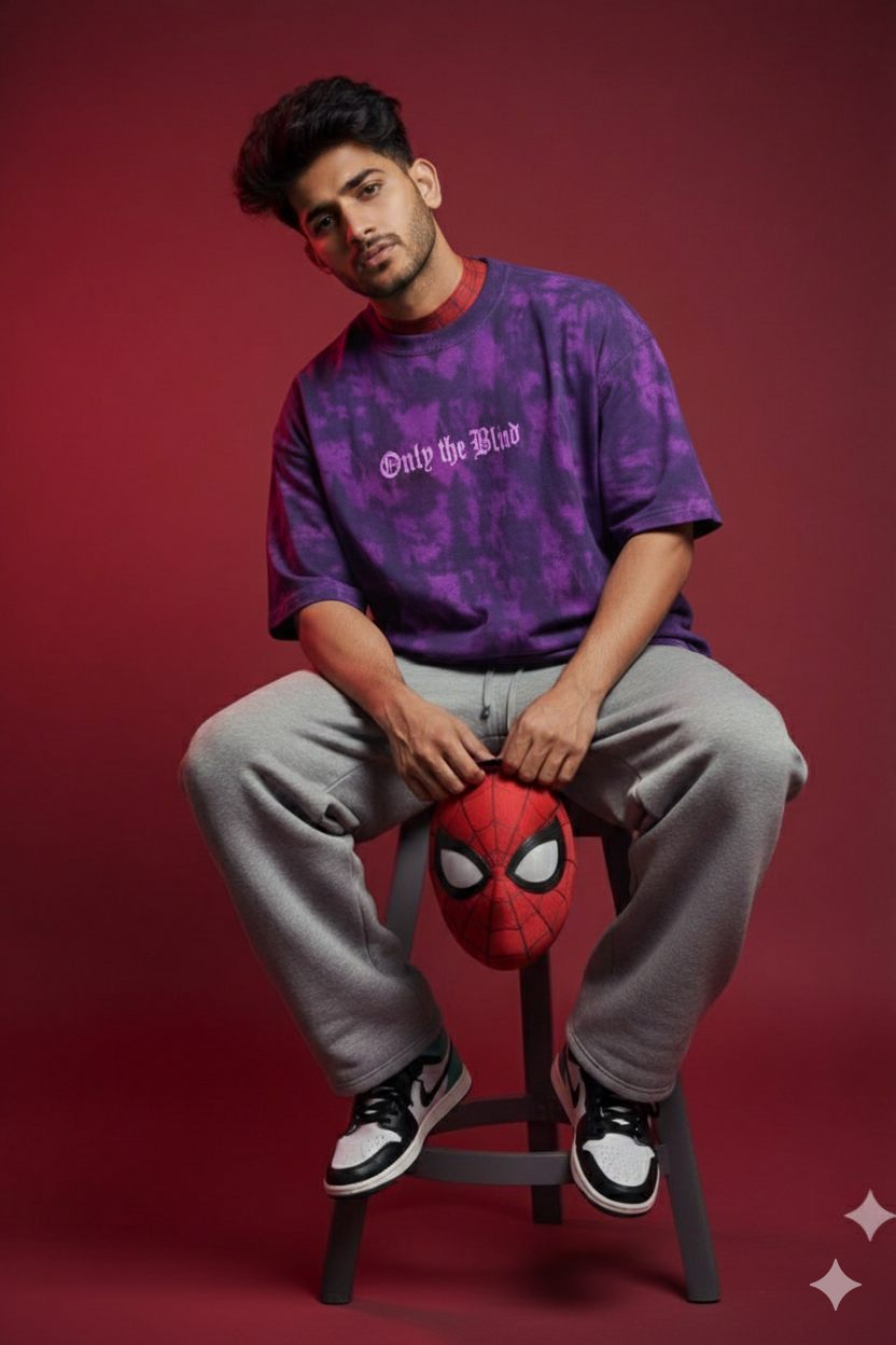 Stand out in style with this bold purple tie-dye T-shirt featuring the statement text "Only the Blind" across the chest in gothic lettering. Designed with intricate white butterfly graphics on the lower side, this oversized tee combines streetwear edge with artistic detail. Crafted from premium cotton for comfort and durability, it’s perfect for casual wear, layering, or making a statement look.